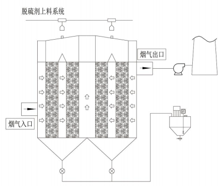 (1)对流工艺: 2)错流工艺: 烟气:从下到上; 烟气:从左到右,从右到左; 脱硫剂:从上到下; 脱硫剂:从上到下; | |