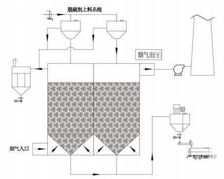 (1)对流工艺: 2)错流工艺: 烟气:从下到上; 烟气:从左到右,从右到左; 脱硫剂:从上到下; 脱硫剂:从上到下; | |