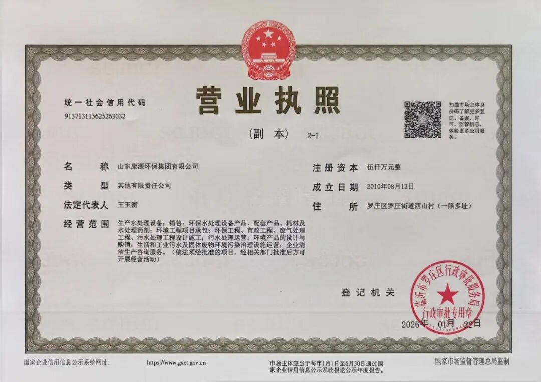 2026年1月22日,山东康源环保集团有限公司(原山东康源环保科技有限公司)已完成工商注册登记等法定程序,正式更名成功。这次更名标志着集团公司的战略转型和业务升级,不但重塑了形象,也提升了市场认知度。